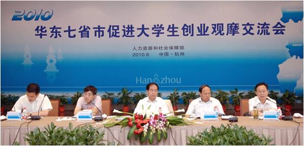 2010年6月23日上午,華東七省市促進(jìn)大學(xué)生創(chuàng)業(yè)觀摩交流會在杭州舉行。人力資源和社會保障部副部長張小建、人力資源和社會保障部就業(yè)促進(jìn)司司長于法鳴、副司長王亞棟、浙江人保廳廳長樂益民及江蘇、安徽、江西、山東、上海、福建、浙江等七省市有關(guān)領(lǐng)導(dǎo)出席會議。會議強(qiáng)調(diào)促進(jìn)大學(xué)生創(chuàng)業(yè),是解決大學(xué)生就業(yè)難的有效途徑,也是促進(jìn)經(jīng)濟(jì)轉(zhuǎn)型升級的重要舉措。要注重創(chuàng)業(yè)意識的培養(yǎng)和創(chuàng)業(yè)能力的培訓(xùn),建立適合創(chuàng)業(yè)的制度和環(huán)境,激發(fā)大學(xué)生創(chuàng)業(yè)潛力。