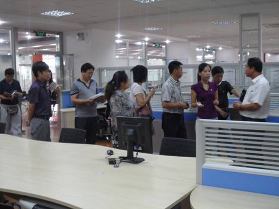 2010年9月20日上午10時許,由遼寧省阜新市勞動局、創業指導中心及院校領導組成的考察團到無錫公共實訓基地,全球模擬公司聯合體中國(無錫)中心進行參觀考察。領導團在我中心的工作人員陪同下,參觀了整個創業實訓區域(四層、五層)并對每個創業實訓模擬公司辦公室的配置作了較為詳細的介紹。參觀過程中,我中心工作人員通過項目介紹、發展情況、具體實施、教材展示以及平臺演示,把“上課”、“上班”、“上網”三者循環及教學特點做了流程化講解,領導們對于項目的課程體系、平臺操作、教學模式以及在錫實施情況得到了較為詳細的了解,并對模擬公司創業實訓項目表示稱贊。
