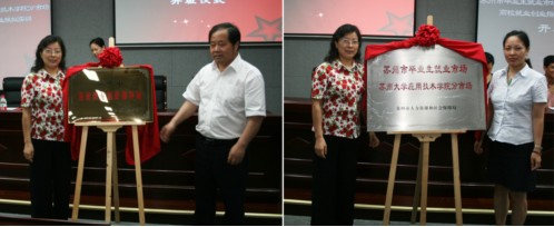 蘇州市大中專畢業(yè)生就業(yè)指導(dǎo)中心副主任馬亞珉、蘇州大學(xué)應(yīng)用技術(shù)學(xué)院常務(wù)副院長傅菊芬為蘇州市畢業(yè)生就業(yè)市場蘇州大學(xué)應(yīng)用技術(shù)學(xué)院分市場揭牌。蘇州市勞動就業(yè)管理服務(wù)中心副主任錢平原、蘇州大學(xué)應(yīng)用技術(shù)學(xué)院常務(wù)副院長傅菊芬共同為高校就業(yè)創(chuàng)業(yè)指導(dǎo)站揭牌,標志著蘇州市高校就業(yè)創(chuàng)業(yè)指導(dǎo)站正式落戶蘇州大學(xué)應(yīng)用技術(shù)學(xué)院。同時也標志著繼蘇州農(nóng)業(yè)職業(yè)技術(shù)學(xué)院、蘇州大學(xué)文正學(xué)院、蘇州經(jīng)貿(mào)職業(yè)技術(shù)學(xué)院、蘇州職業(yè)大學(xué)、蘇州衛(wèi)生職業(yè)學(xué)院、蘇州工業(yè)職業(yè)技術(shù)學(xué)院、蘇州工藝美術(shù)職業(yè)技術(shù)學(xué)院建站以來,蘇州市第八個高校就業(yè)創(chuàng)業(yè)指導(dǎo)站成功建立。