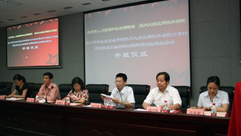 2011年6月20日,蘇州市畢業(yè)生就業(yè)市場蘇州大學(xué)應(yīng)用技術(shù)學(xué)院分市場、蘇州市高校就業(yè)創(chuàng)業(yè)指導(dǎo)站揭牌暨創(chuàng)業(yè)模擬實訓(xùn)開班儀式在蘇州大學(xué)應(yīng)用技術(shù)學(xué)院隆重舉行。蘇州市大中專畢業(yè)生就業(yè)指導(dǎo)中心主任劉衛(wèi)國、副主任馬亞珉、蘇州市勞動就業(yè)管理服務(wù)中心副主任錢平原等領(lǐng)導(dǎo)、蘇州大學(xué)應(yīng)用技術(shù)學(xué)院常務(wù)副院長傅菊芬、黨委書記劉楓、對外合作處、招生就業(yè)處處長陳建軍、學(xué)生工作處處長張衛(wèi)等領(lǐng)導(dǎo)出席本次儀式,揭牌儀式由劉衛(wèi)國主持。