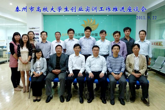 2011年9月22日下午,泰州市人力資源和社會(huì)保障局和全球模擬公司聯(lián)合體中國(泰州)中心共同舉辦了泰州高校大學(xué)生創(chuàng)業(yè)實(shí)訓(xùn)工作推進(jìn)座談會(huì)。泰州市人力資源和社會(huì)保障局就業(yè)管理中心張主任、趙科長,中國就業(yè)促進(jìn)會(huì)創(chuàng)業(yè)專業(yè)委員會(huì)副主任、全球模擬公司聯(lián)合體中國中心副主任彭樂群,全球模擬公司聯(lián)合體中國(泰州)中心陸潮煒以及來自泰州市9個(gè)學(xué)校的領(lǐng)導(dǎo)共同出席了此次座談會(huì)。