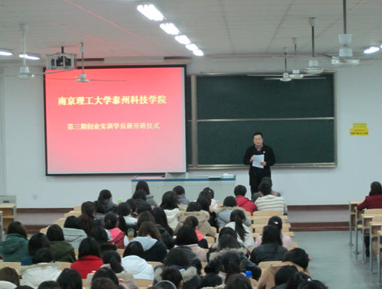 2012年3月20日19時(shí),南京理工大學(xué)泰州學(xué)院第三期創(chuàng)業(yè)實(shí)訓(xùn)培訓(xùn)班開(kāi)班儀式在多功能報(bào)告廳舉行。南京理工大學(xué)泰州學(xué)院商學(xué)院院長(zhǎng)助理徐老師 、泰州市就業(yè)管理中心綜合培訓(xùn)科主任張德榮、全球模擬公司聯(lián)合體中國(guó)(泰州)中心主任陸潮煒,6位創(chuàng)業(yè)實(shí)訓(xùn)教師及參加培訓(xùn)班的300名學(xué)員共同出席了開(kāi)班儀式。開(kāi)班儀式由南京理工大學(xué)泰州學(xué)院商學(xué)院院長(zhǎng)助理徐老師主持。