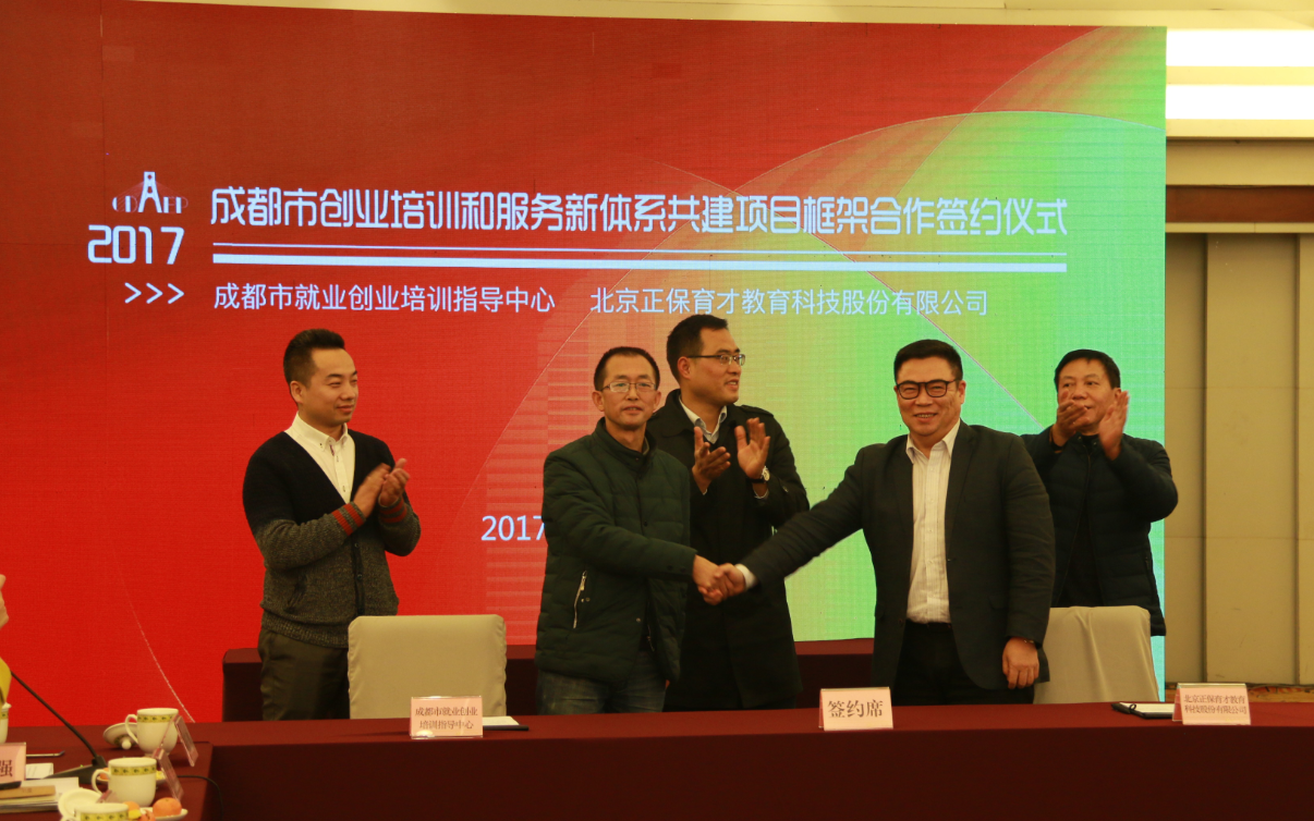 大會最后,為構(gòu)建成都市創(chuàng)業(yè)培訓(xùn)和服務(wù)新體系,借鑒國內(nèi)外先進(jìn)經(jīng)驗,突出成都市區(qū)位特色,正保育才公司與成都市就業(yè)創(chuàng)業(yè)培訓(xùn)指導(dǎo)中心簽署了框架合作協(xié)議。雙方將在“總體規(guī)劃,分步實施;先易后難,循序漸進(jìn);平等互惠,共建共享;優(yōu)勢互補(bǔ),合作共贏”的原則下,就共建創(chuàng)業(yè)服務(wù)云平臺、創(chuàng)業(yè)引領(lǐng)服務(wù)示范基地等方面展開深度合作。