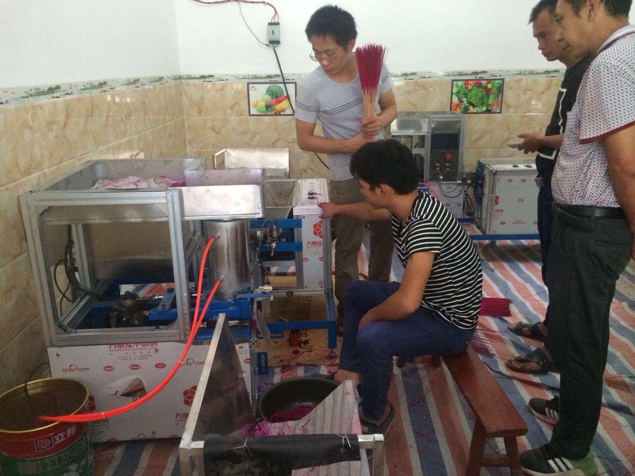實用新型制香機,機重約200公斤(代辦托運)投入流動資金1000元,購齊原料,接上二相電源(220V照明電)即可生產,一周內包出產品。因為其中大部分原料就地取材,且價格甚微,可有效地進行市場產品調節,而經久不衰,市場證明創辦機械制香廠確為投資少,零風險、見效快的冷門致富項目。